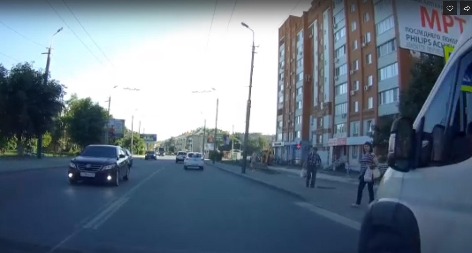 Водитель остановился в левом ряду, следом остановился шофер автомобиля Toyota, и женщина уже почти вышла на проезжую часть, как вдруг поняла, что маршрутка №2а, двигающаяся в ближайшем к тротуару ряду, не планирует останавливаться.