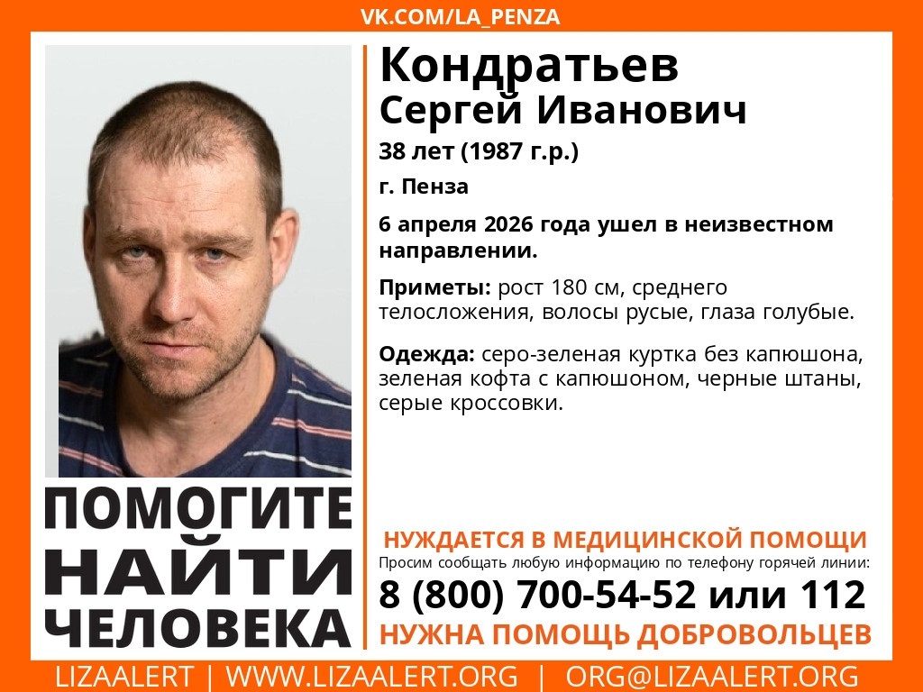 06 апреля 2026 г., РИА Пензенской области. В Пензе разыскивают 38-летнего Сергея Ивановича Кондратьева. Мужчина нуждается в медицинской помощи. В понедельник, 6 апреля, он ушел в неизвестном направлении.