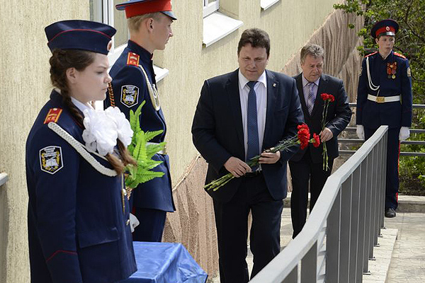 Место проведения мероприятия было выбрано неслучайно. На здании два года назад была установлена памятная доска, посвященная памяти педагогов, участвовавших в боях за Родину.