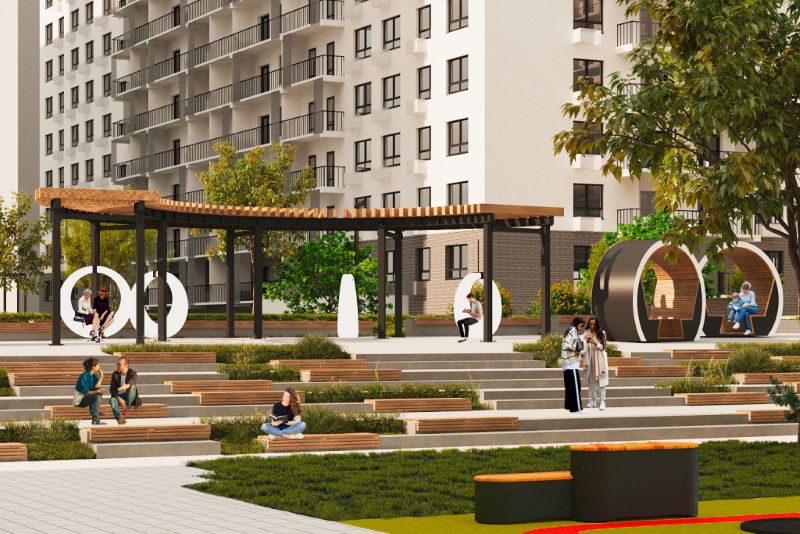 Не забыл застройщик и о благоустройстве. Каждый двор - это большое и приятное общественное пространство для отдыха, игр, тренировок и даже работы - во дворе есть доступный и бесплатный вай-фай.