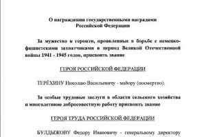 «Решение Президента присвоить Николаю Васильевичу Терехину звание Героя России - это восстановление справедливости, сохранение исторической памяти, напоминание всем нам о том, что мы являемся наследниками поколения победителей. Это особенно важно сейчас, когда Родина снова в опасности и неонацисты проверяют нас на прочность. Будем достойны памяти наших великих предков», - подчеркнул Олег Мельниченко.
