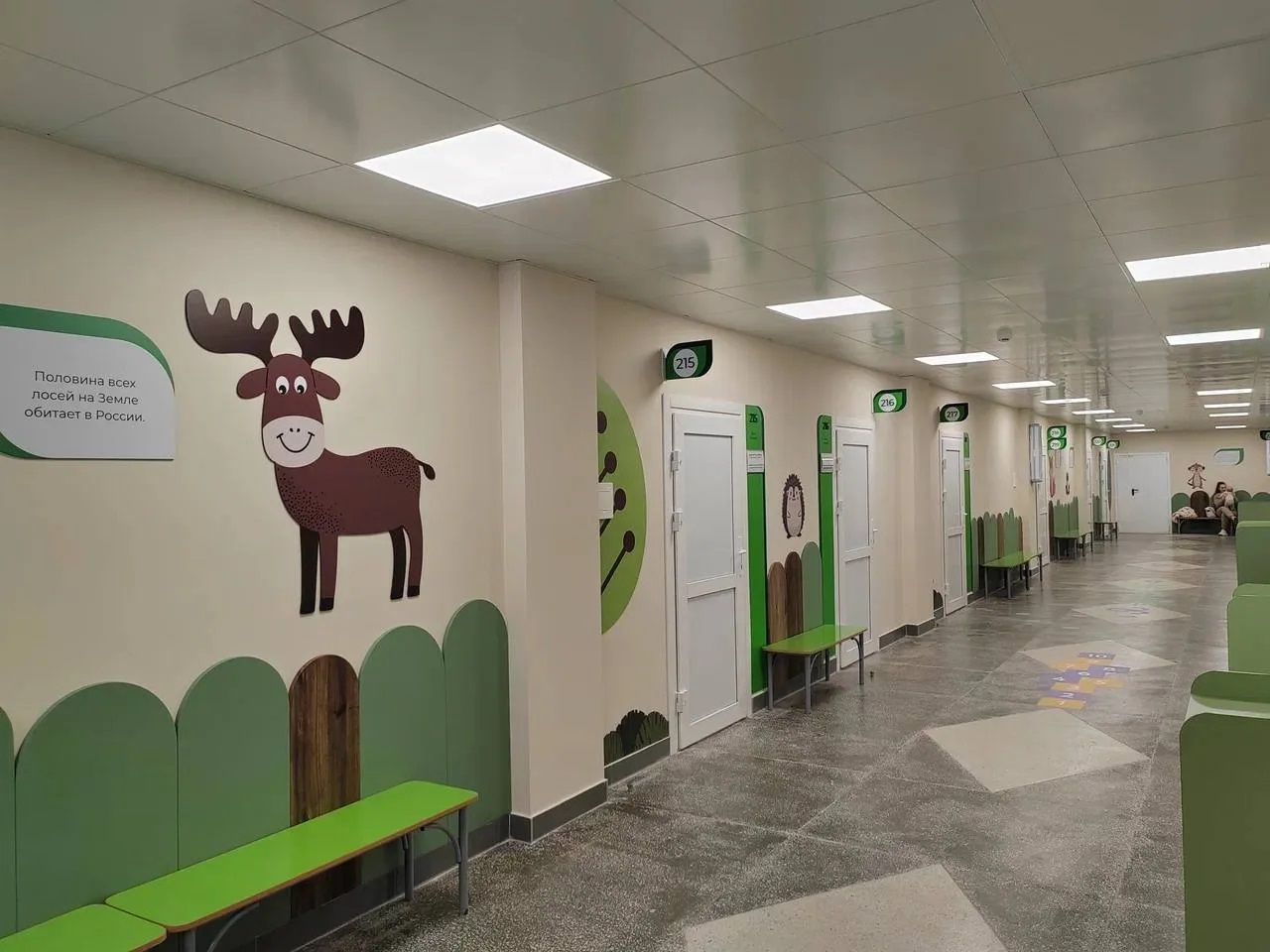 На втором этаже, в детской поликлинике, появились доски с развивающими задачками, и арт-объект - огромное дерево в фойе, и изображения на стенах животных с любопытными фактами о них.