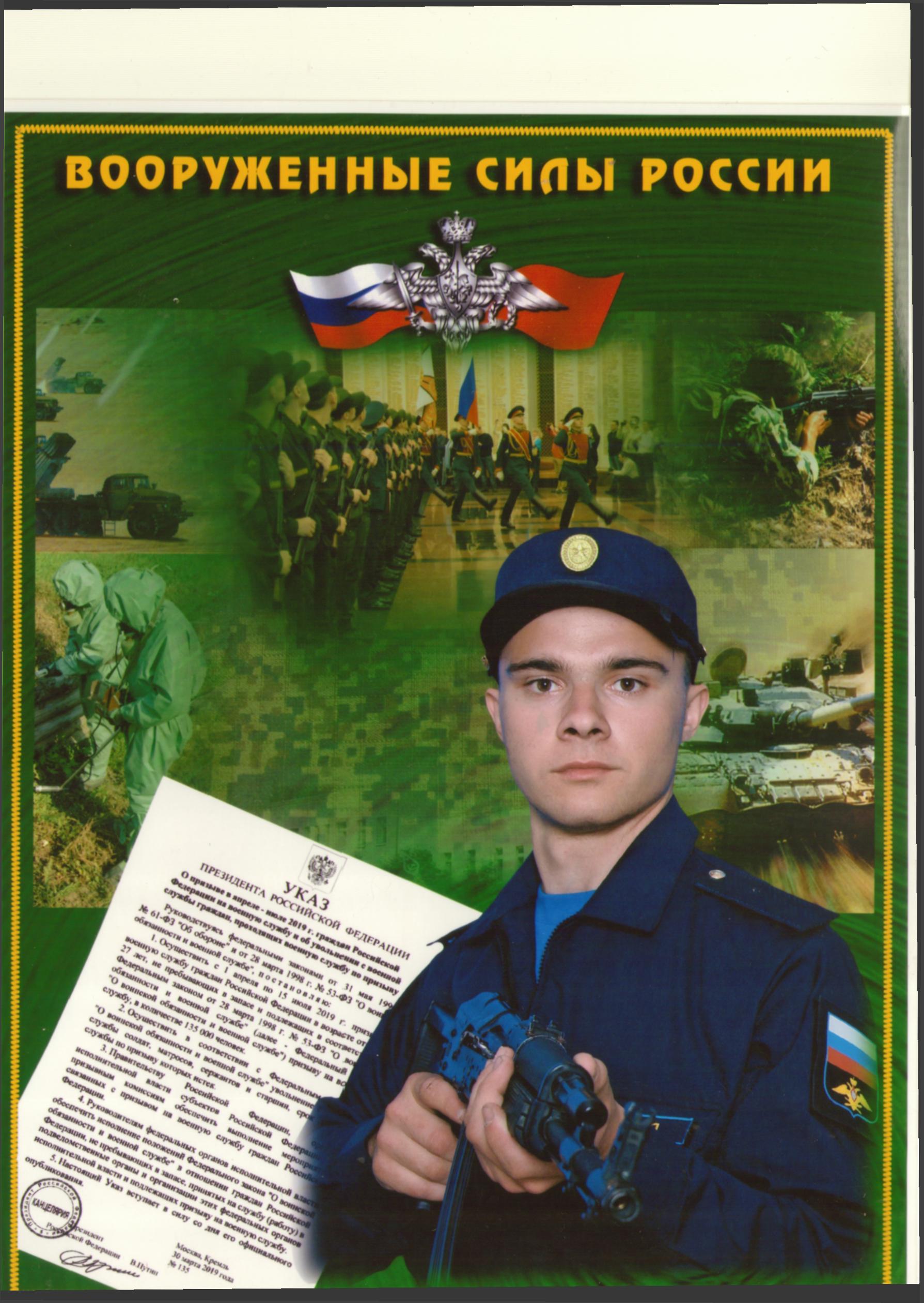 Сейчас он служит в должности разведчика пункта воздушного наблюдения. Его служба проходит не в казарме, а в бункере, под землей. Многое засекречено, поэтому юноша рассказывал только о чисто житейских моментах. Свободного времени абсолютно нет. Каждая минута чем-то заполнена: либо армейские дела, либо спорт. «Физическую форму нужно поддерживать, так что турник, брусья — мои лучшие друзья», - шутит солдат.