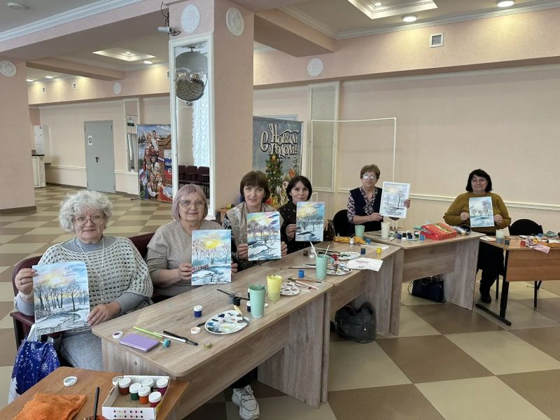 В уроке участвовали женщины старше 50 лет. Смешивание красок и построение композиции - это интеллектуальная работа, которая помогает сохранять ясность ума, память и концентрацию внимания на долгие годы.